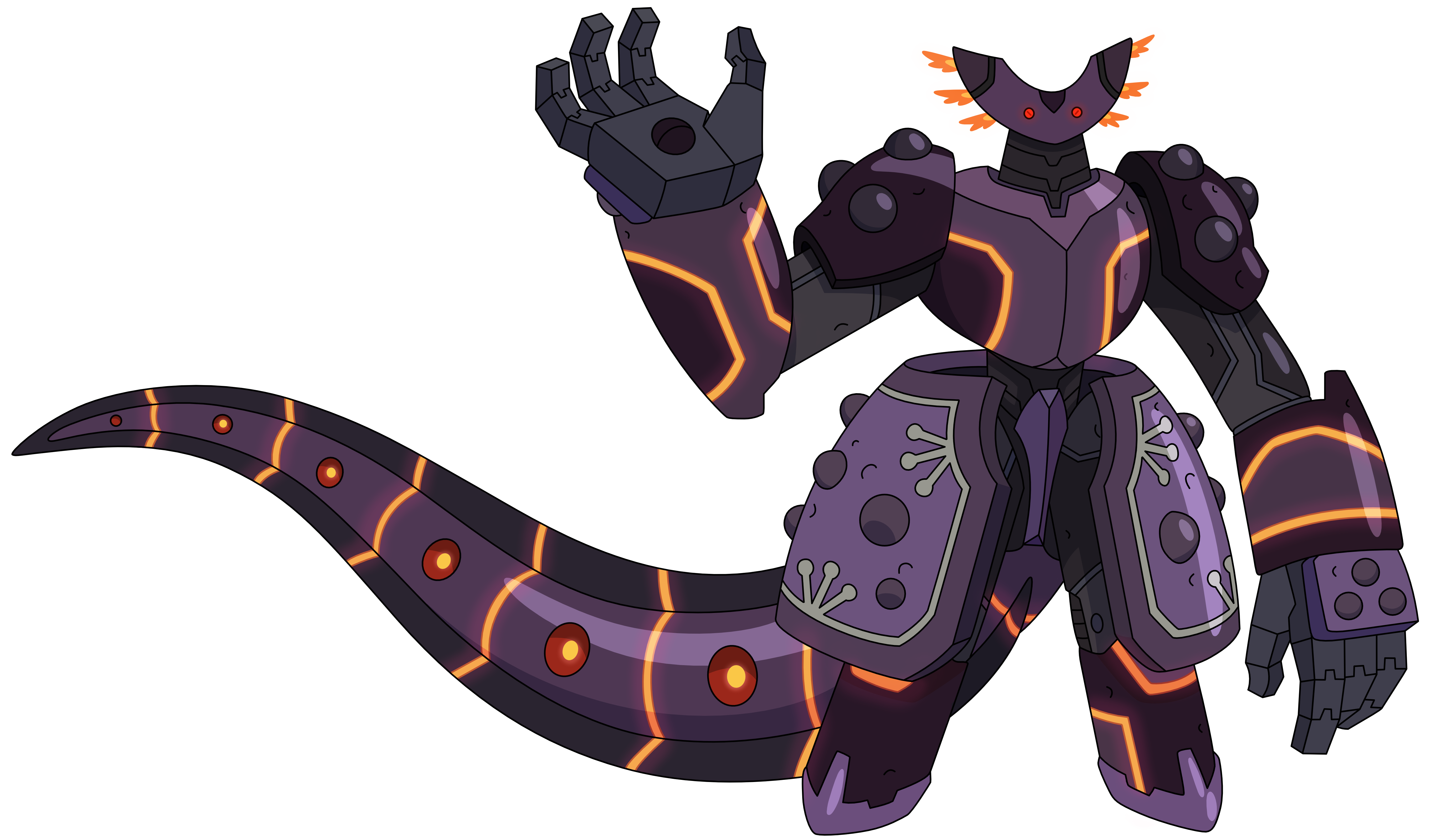 The Dyoplosaurus is a gargantuan light-purple and dark violet mech exoskeleton with orange flowing energy lining the tail, chest plate, arms, and legs. There is a deep purple wraparound shield on the waist with frog legs and warty designs, with a plum shaped main body and pauldrons with another wart-like design.(Many other designs in the show have something similar, such as Sasha's pauldrons on her rebellion armor.) It also includes cuffs around the wrist and metal-plated feet. The head is a crescent-moon resembling an axolotl, connecting to the juxtaposed newt-like design.