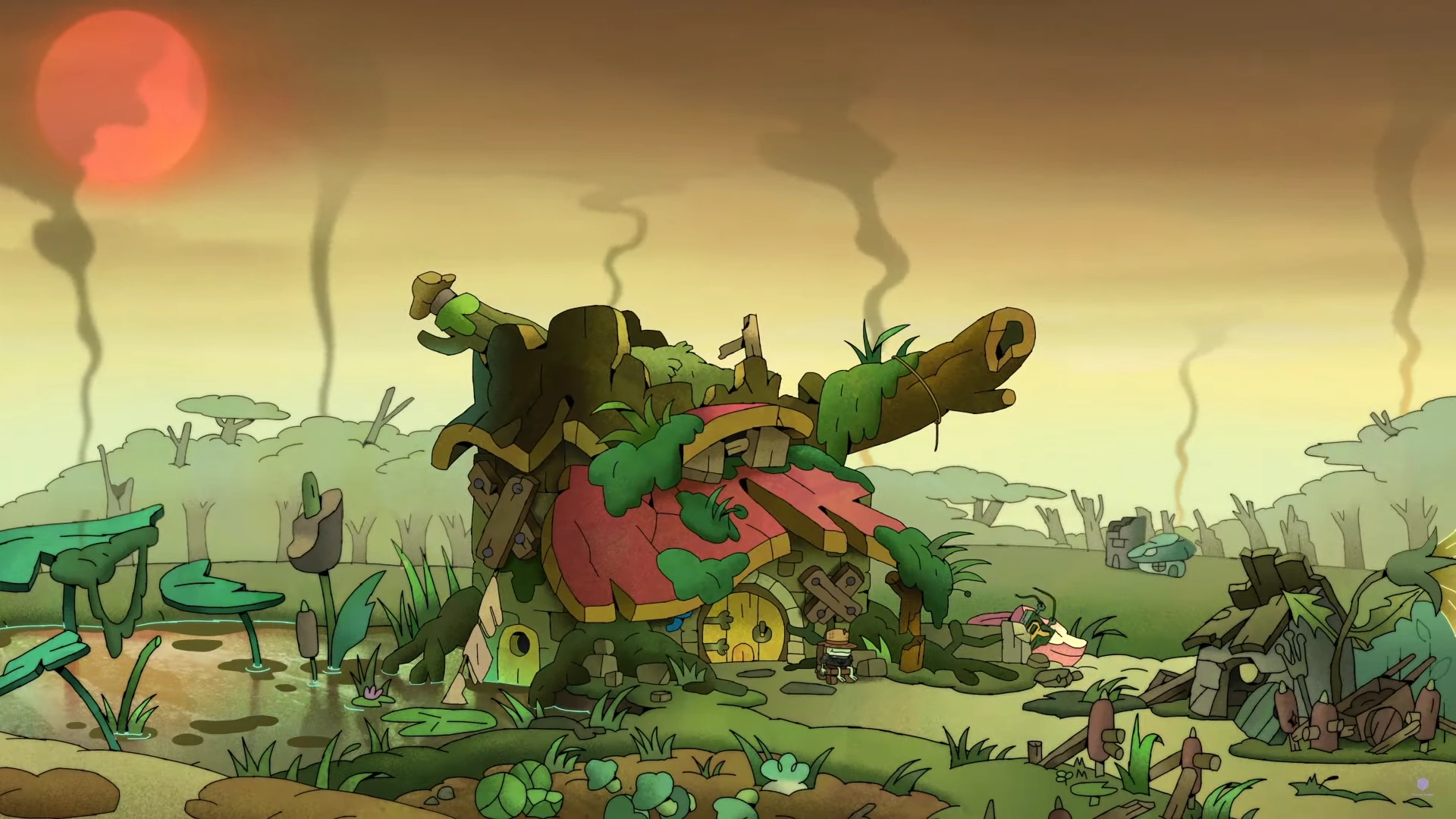 The Plantar farm consists of a housing unit surrounded by fields and a little red shed where tools are placed. The house is quite aged and is made from the stump of a tree as is the case for a number of houses in Wartwood. There is a small yellow wooden front door and a circular window beside it. A bio-luminescent mushroom has also been implanted beside the door acting as the light of the front porch. The house appears to have three floors and has a red wooden roof with a large branch protruding from the side. Moss and grass are also seen prominently growing throughout the exterior of the house. There is also a small wooden chimney set atop the third floor's roof. The back porch also has access to a lake where the Plantars keep a moored ship.